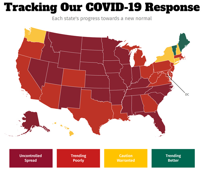 To summarize, Georgia appears to be doing better in several rankings, but that’s really a reflection of how badly things are going elsewhere in the country. The map shown below from COVID Exit Strategy explains what I mean. The vast majority of the country is either trending poorly or showing uncontrolled spread of the disease.