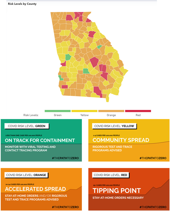 Here is how the state of Georgia is looking based on the risk tool from the Harvard Global Health Institute. The color coding is explained below the map.