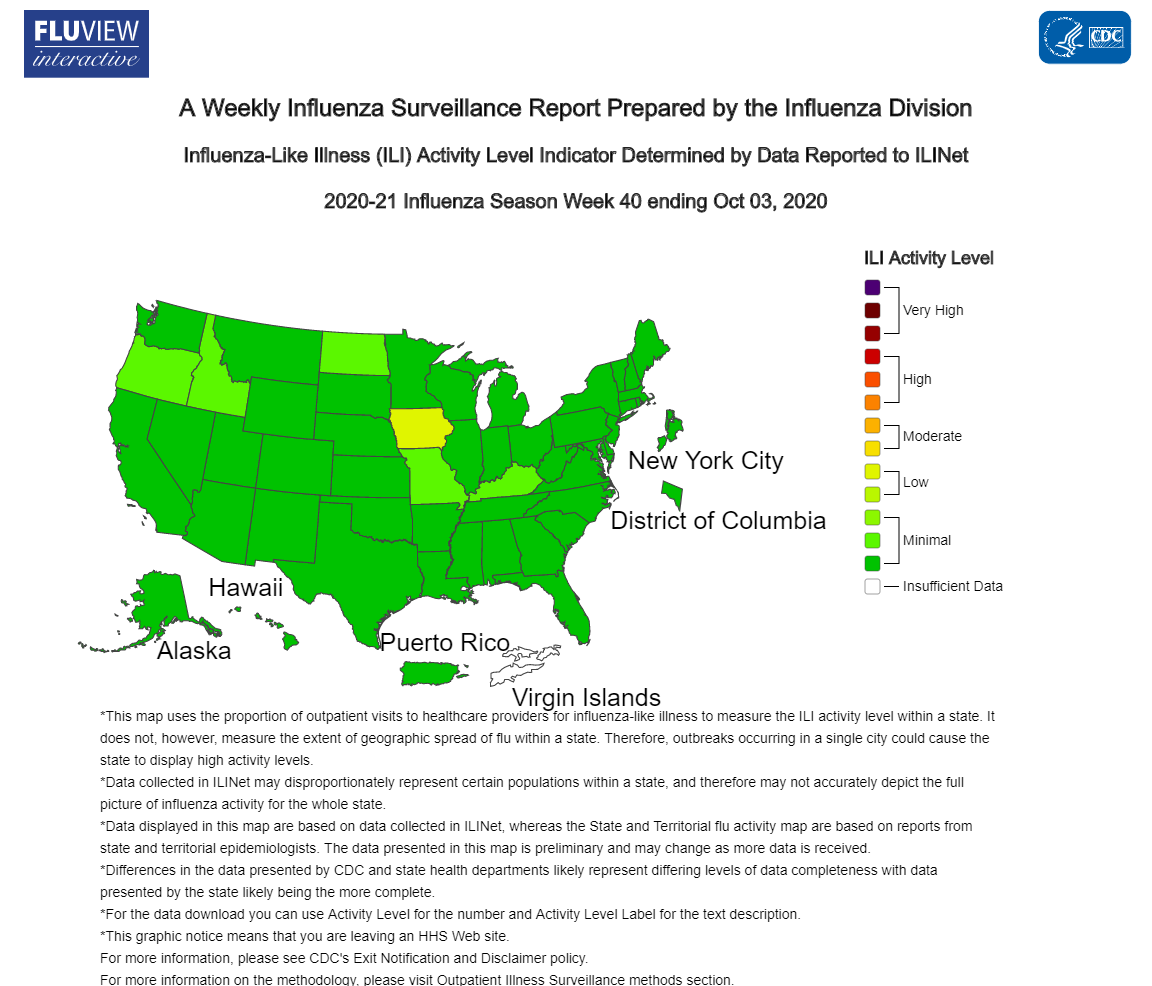 The changes compared to last week is that Iowa moved into the yellow (low) zone, Puerto Rico dropped back into minimal levels. Oregon, North Dakota and Kentucky saw increases too. Georgia remains in the most minimal of the minimal section. Keep in mind that influenza is not a mandatory notifiable disease for public health departments like COVID-19 is. But there is a robust surveillance network for tracking trends. So we aren’t likely to see case counts and death counts like we do for COVID-19 because we are seeing estimates for influenza rather than actual numbers. Both diseases feature a wide spectrum of disease severity that can make it hard to identify all cases.
