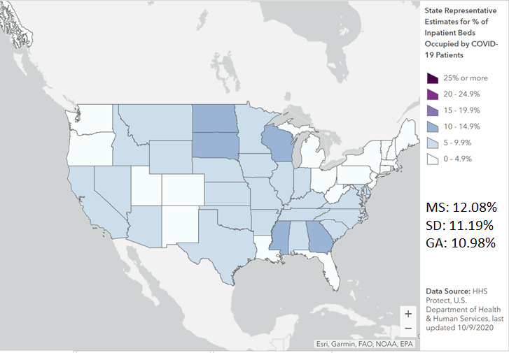 Georgia is now ranked #3 in the nation (down from #1 last week) for proportion of inpatient beds occupied by COVID patients (10.98%), just behind of Mississippi (12.08%) and South Dakota (11.19%). These data come from the Health and Human Services dashboard which was last updated on 09Oct.